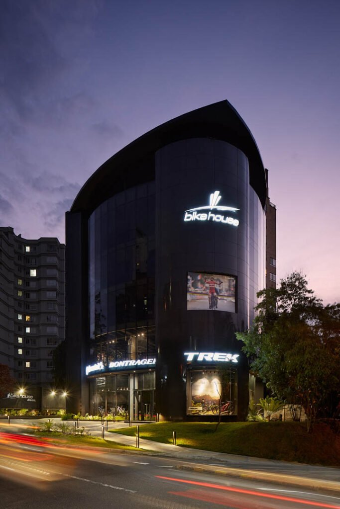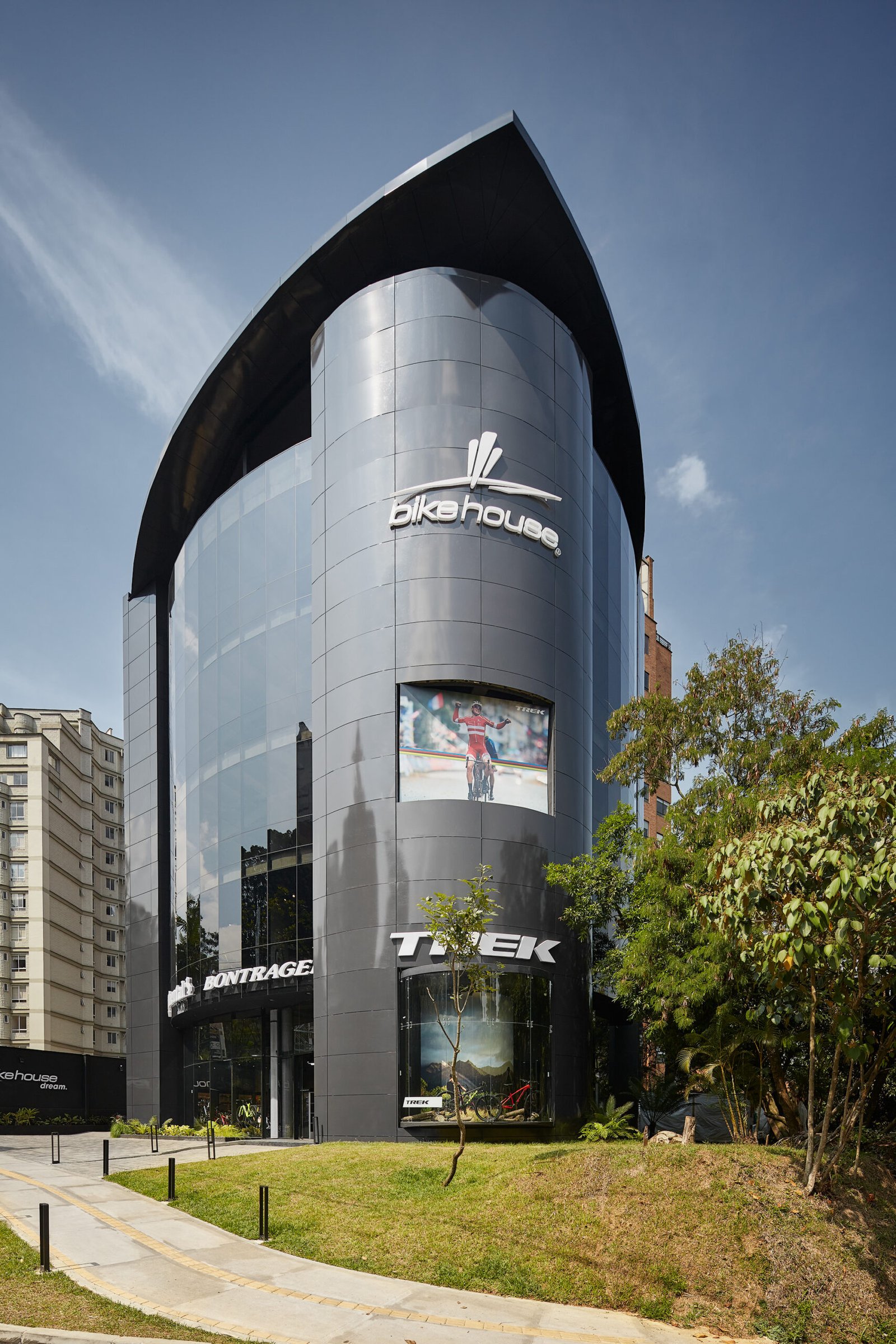Un imponente volumen curvo, que busca resaltar en su entorno, el cual se rodea de edificaciones ortogonales, en ladrillo de barro o tonalidades claras. Su forma evoca a la de una montaña, como la cima de esta, la cual representa una recompensa para el ciclista. Bike House, ubicado en la Loma del Campestre, Medellín, funciona como sede principal de la empresa, con espacios comerciales para la venta de productos para ciclistas y a su vez como oficinas en los niveles superiores.