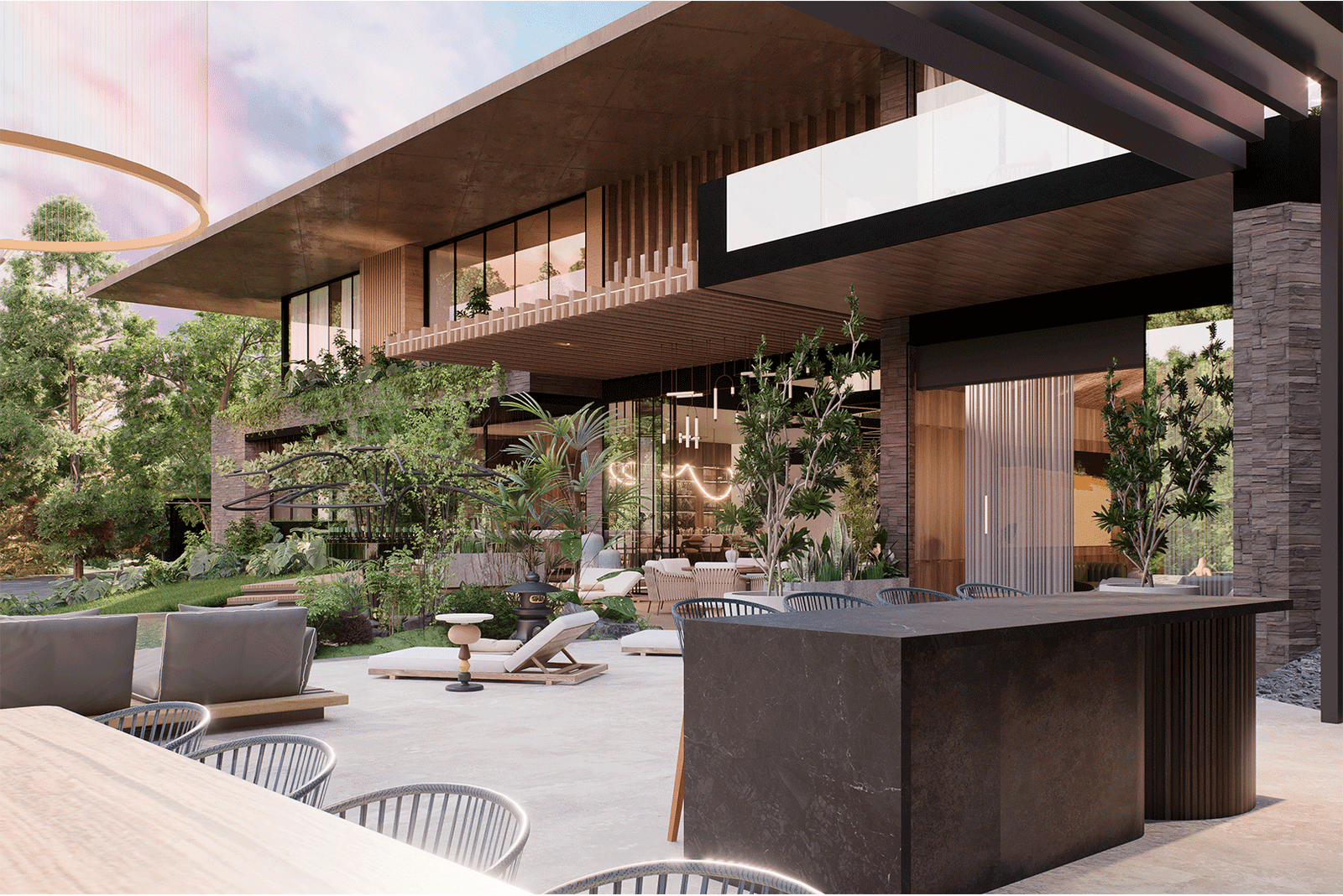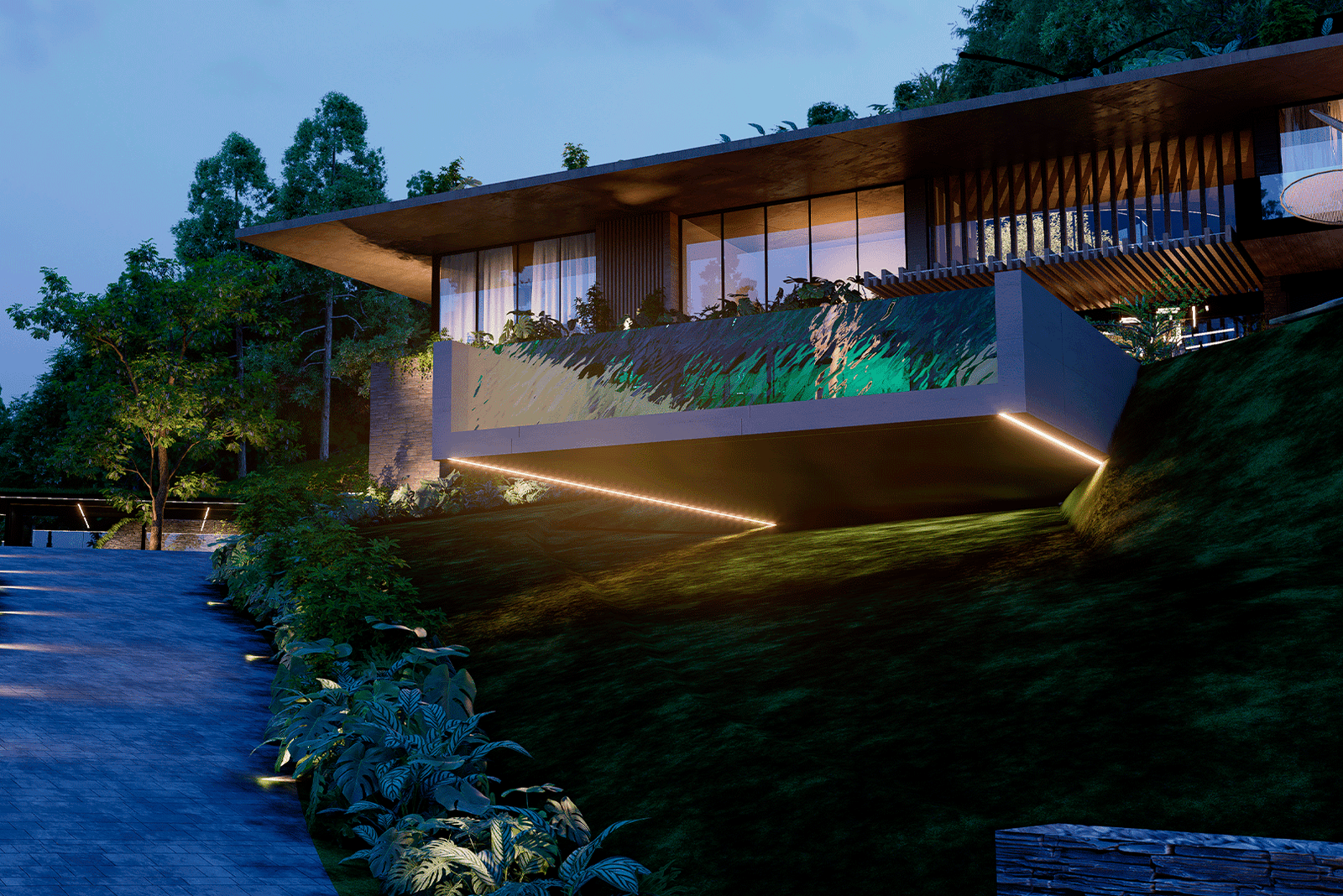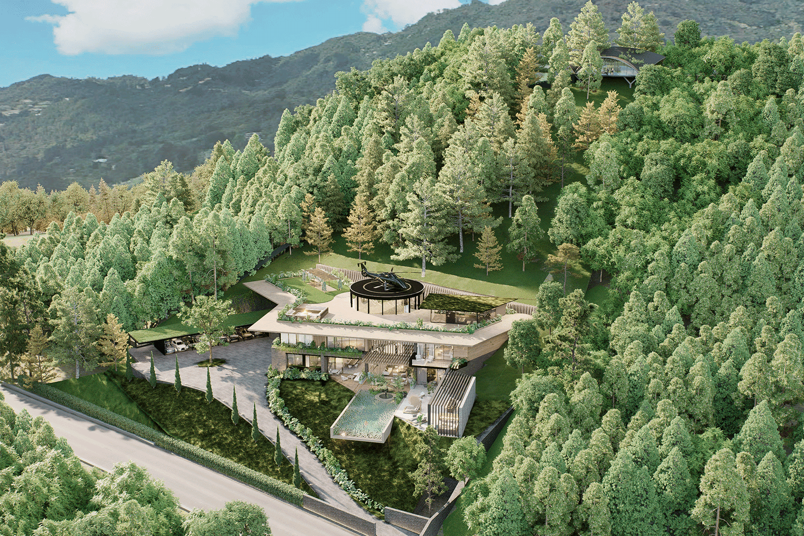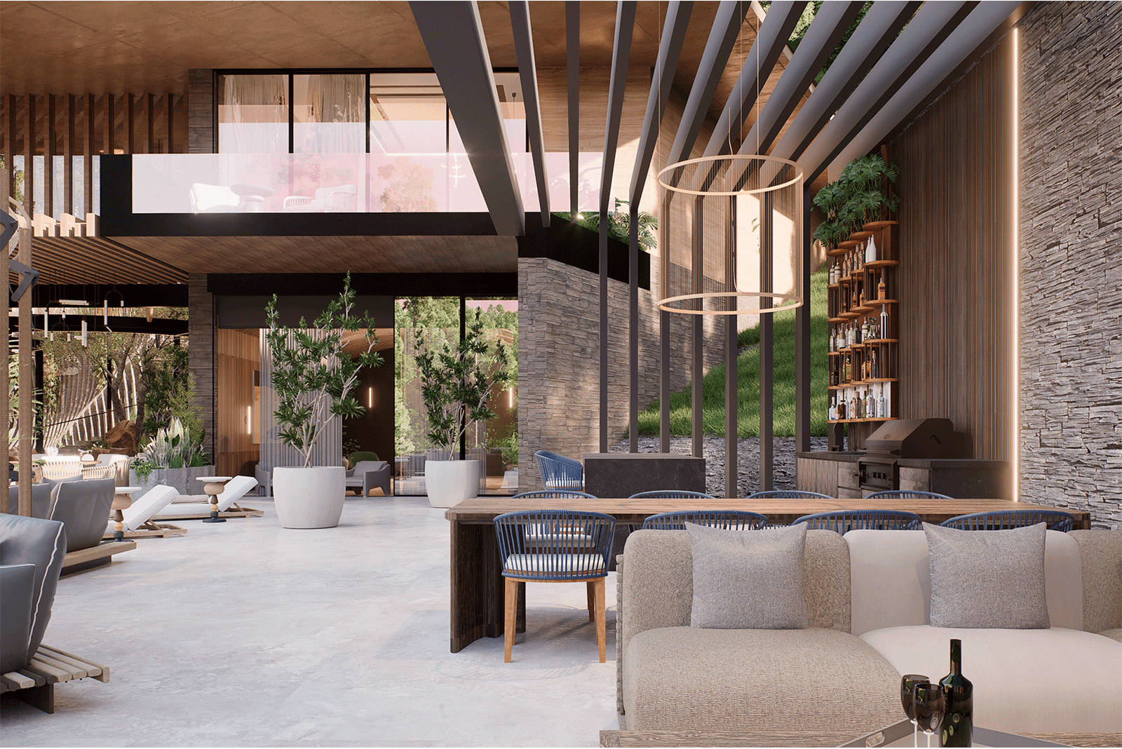 El proyecto se desarrolla bajo un lenguaje moderno y sobrio, caracterizado por líneas puras y proporciones cuidadas, donde el lujo se expresa a través de la calidad de los materiales, la integración con la naturaleza y la amplitud espacial. La arquitectura establece un diálogo constante con su entorno inmediato y su contexto más amplio, aprovechando de manera estratégica tanto la presencia envolvente del paisaje tropical como las vistas lejanas hacia la ciudad de San Salvador, que se convierten en un telón de fondo privilegiado para la vida diaria y los eventos sociales.