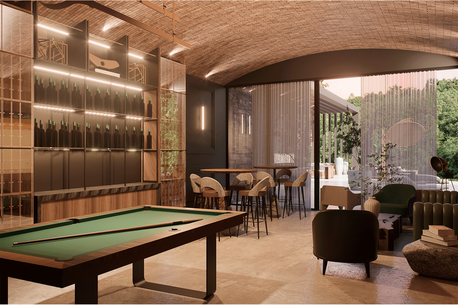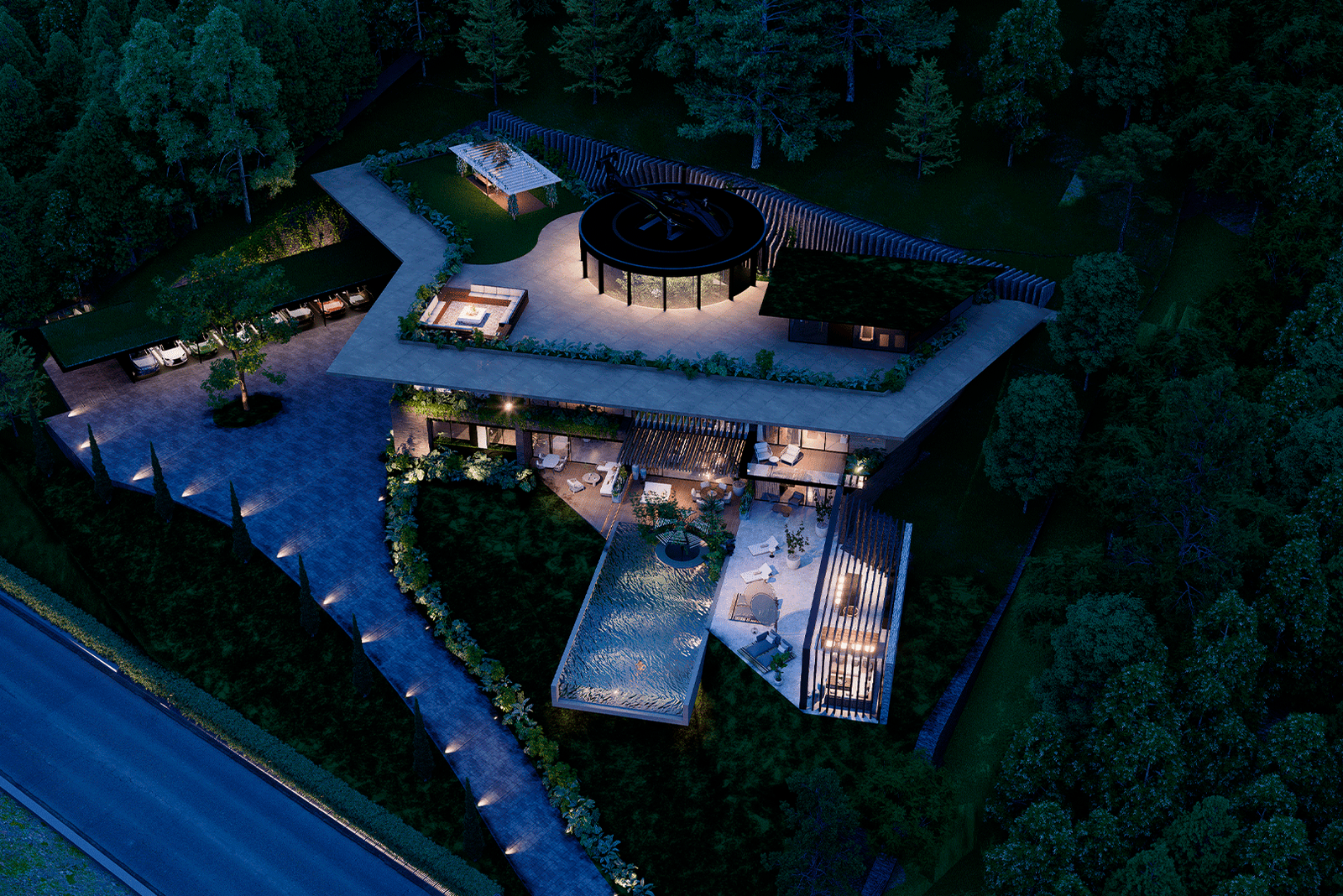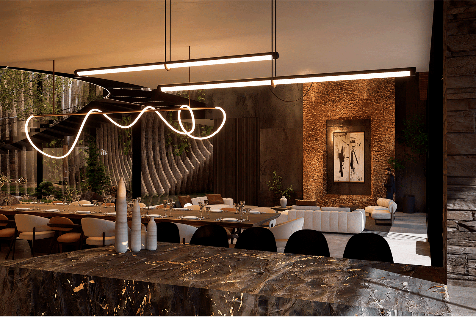 El proyecto se desarrolla bajo un lenguaje moderno y sobrio, caracterizado por líneas puras y proporciones cuidadas, donde el lujo se expresa a través de la calidad de los materiales, la integración con la naturaleza y la amplitud espacial. La arquitectura establece un diálogo constante con su entorno inmediato y su contexto más amplio, aprovechando de manera estratégica tanto la presencia envolvente del paisaje tropical como las vistas lejanas hacia la ciudad de San Salvador, que se convierten en un telón de fondo privilegiado para la vida diaria y los eventos sociales.
