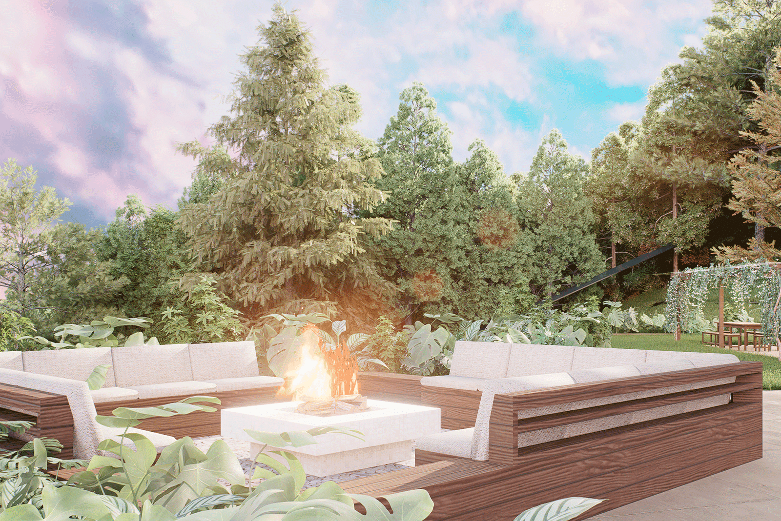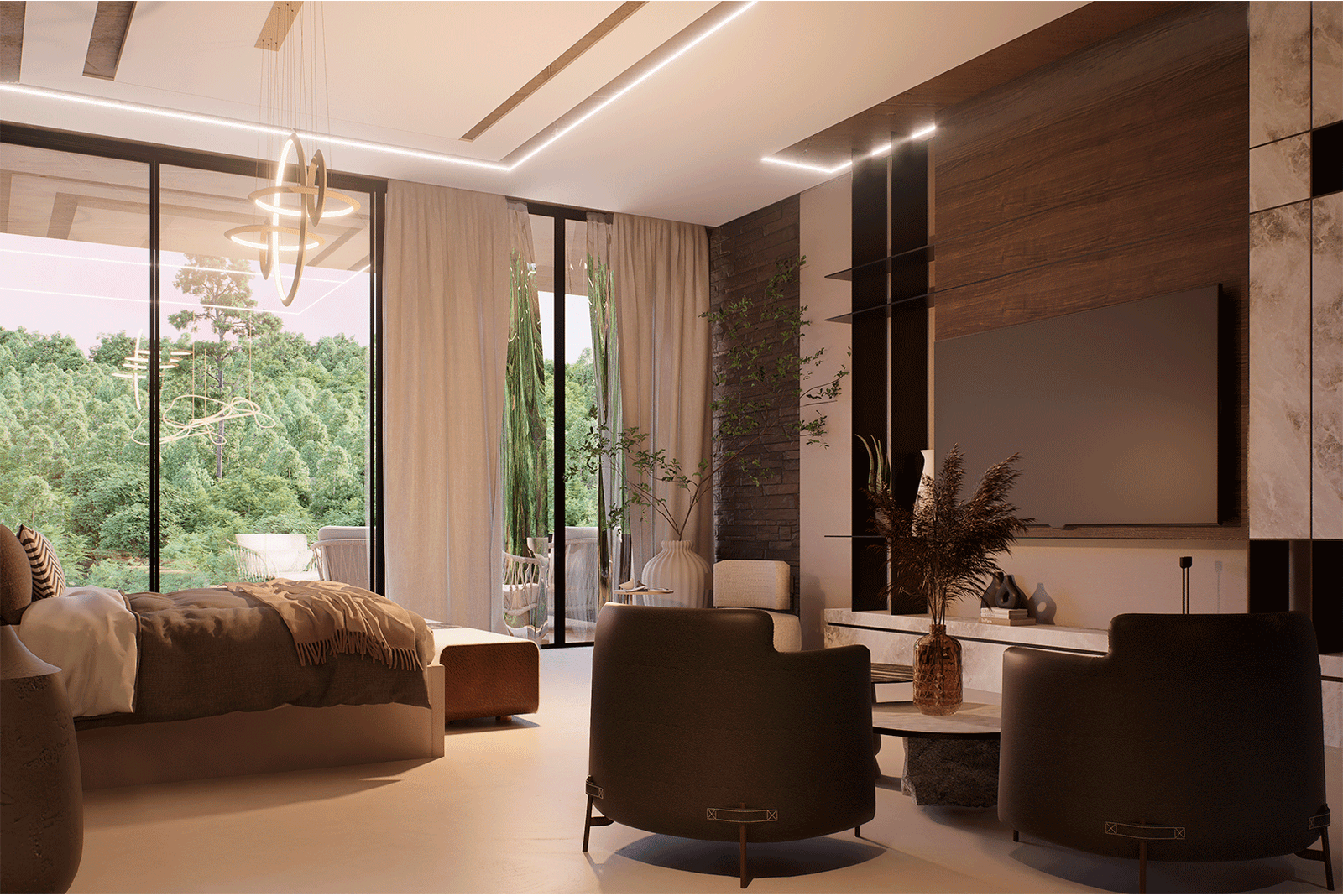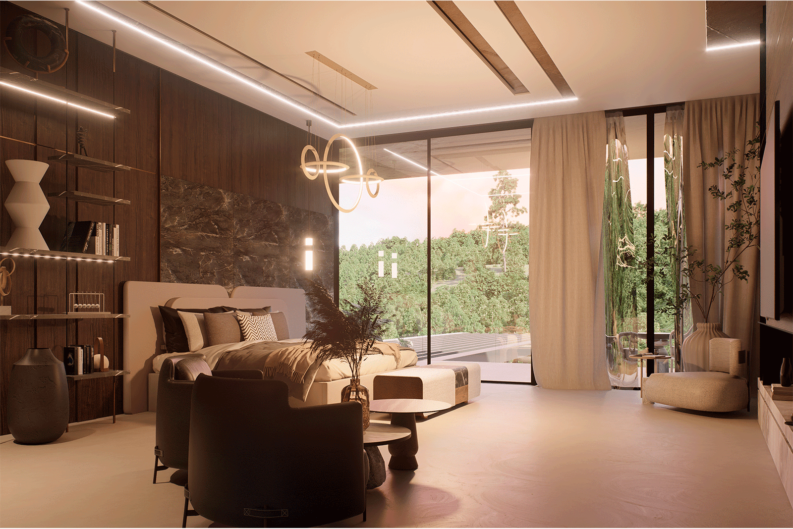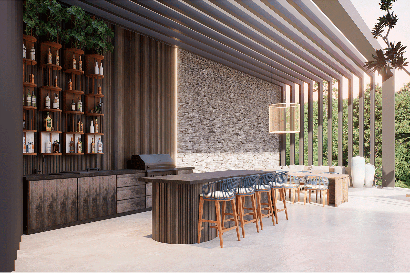 El proyecto se desarrolla bajo un lenguaje moderno y sobrio, caracterizado por líneas puras y proporciones cuidadas, donde el lujo se expresa a través de la calidad de los materiales, la integración con la naturaleza y la amplitud espacial. La arquitectura establece un diálogo constante con su entorno inmediato y su contexto más amplio, aprovechando de manera estratégica tanto la presencia envolvente del paisaje tropical como las vistas lejanas hacia la ciudad de San Salvador, que se convierten en un telón de fondo privilegiado para la vida diaria y los eventos sociales.