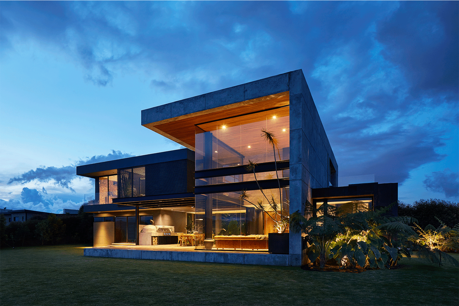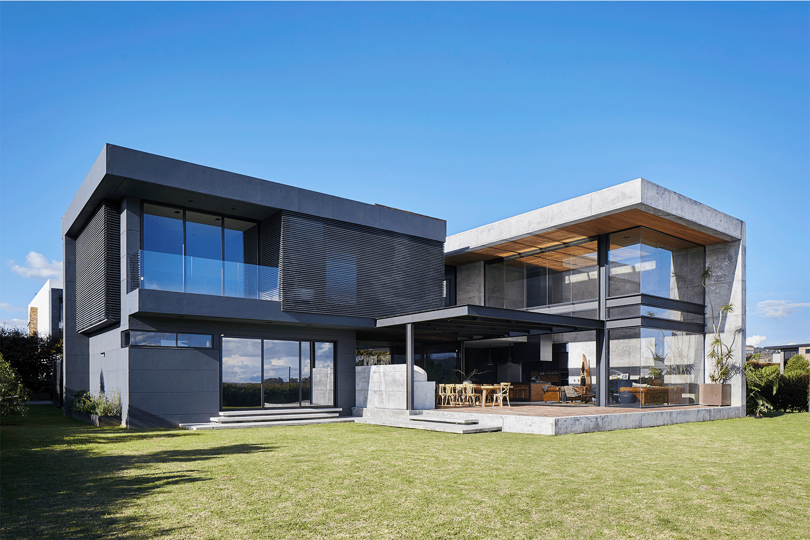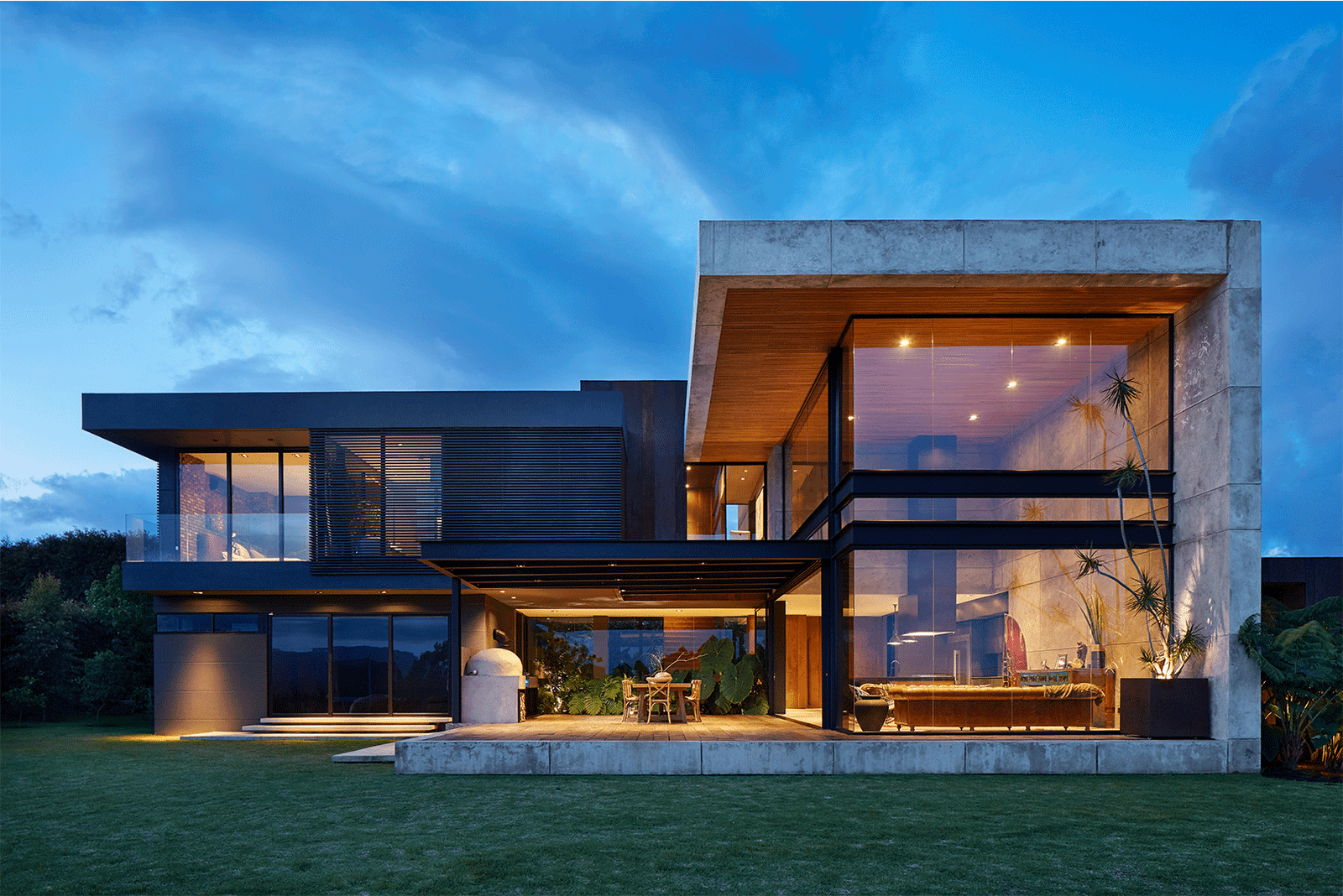 El volumen principal, de dos niveles, se abre mediante fachadas completamente acristaladas que permiten que la luz se convierta en protagonista y que el paisaje ingrese sin restricciones al interior. La doble altura central actúa como un vacío luminoso que organiza la vida social de la casa, mientras que las cubiertas extendidas enmarcan las visuales y protegen las terrazas exteriores.
