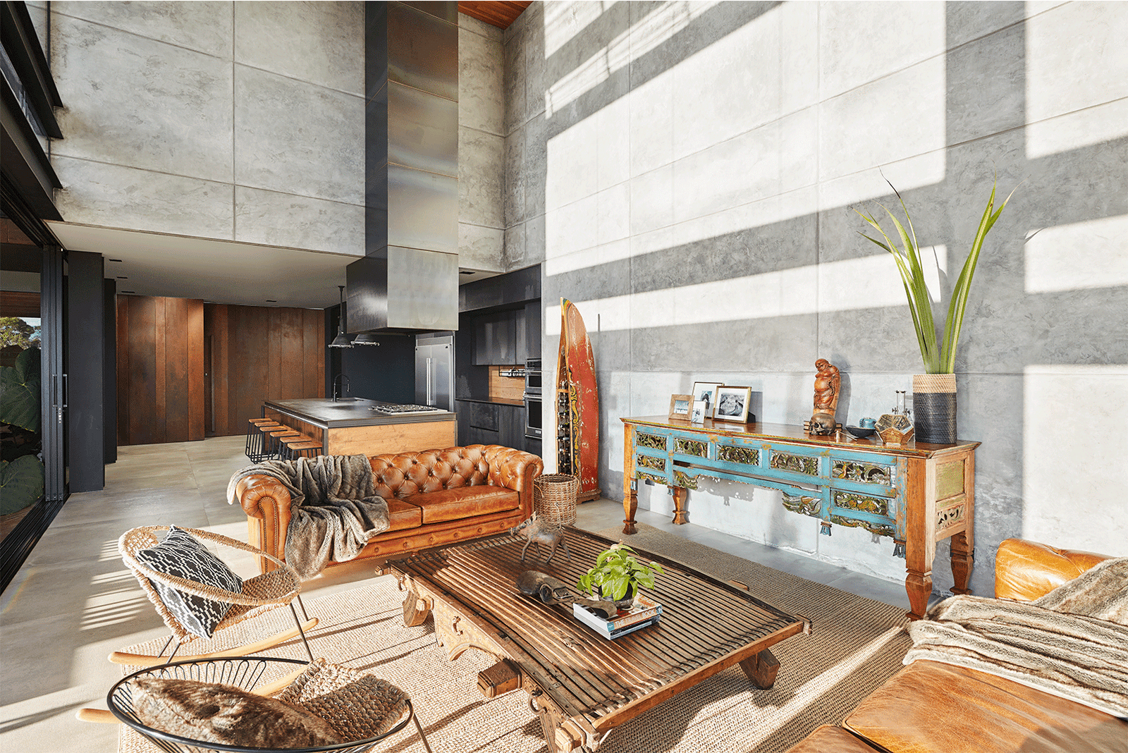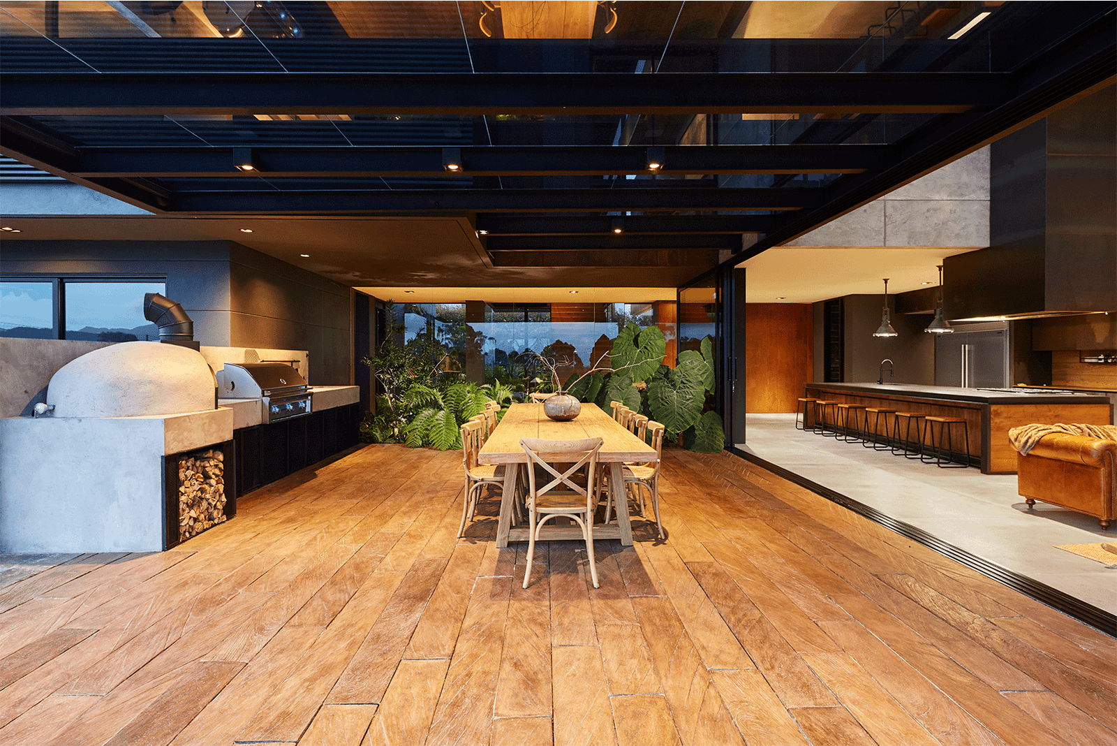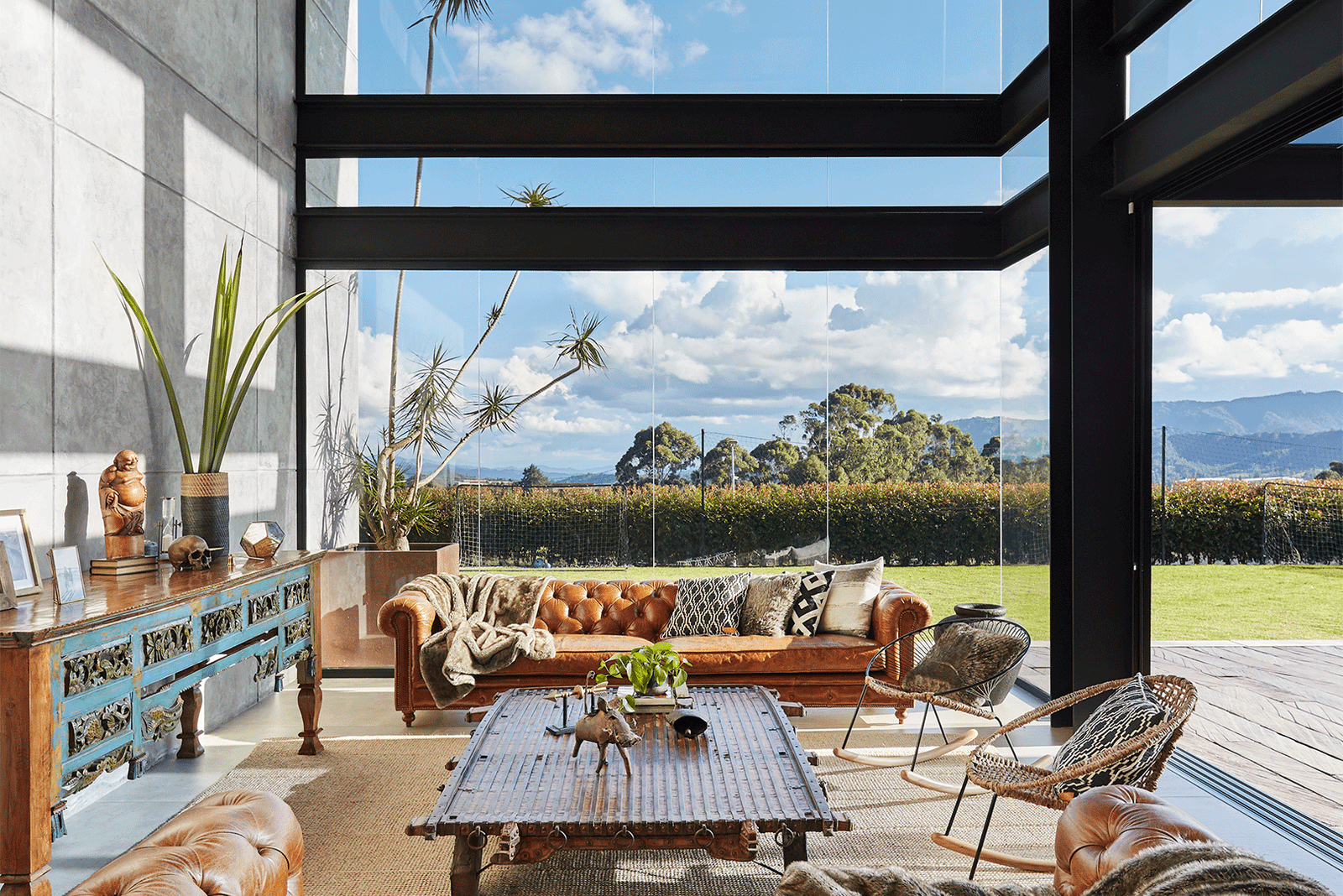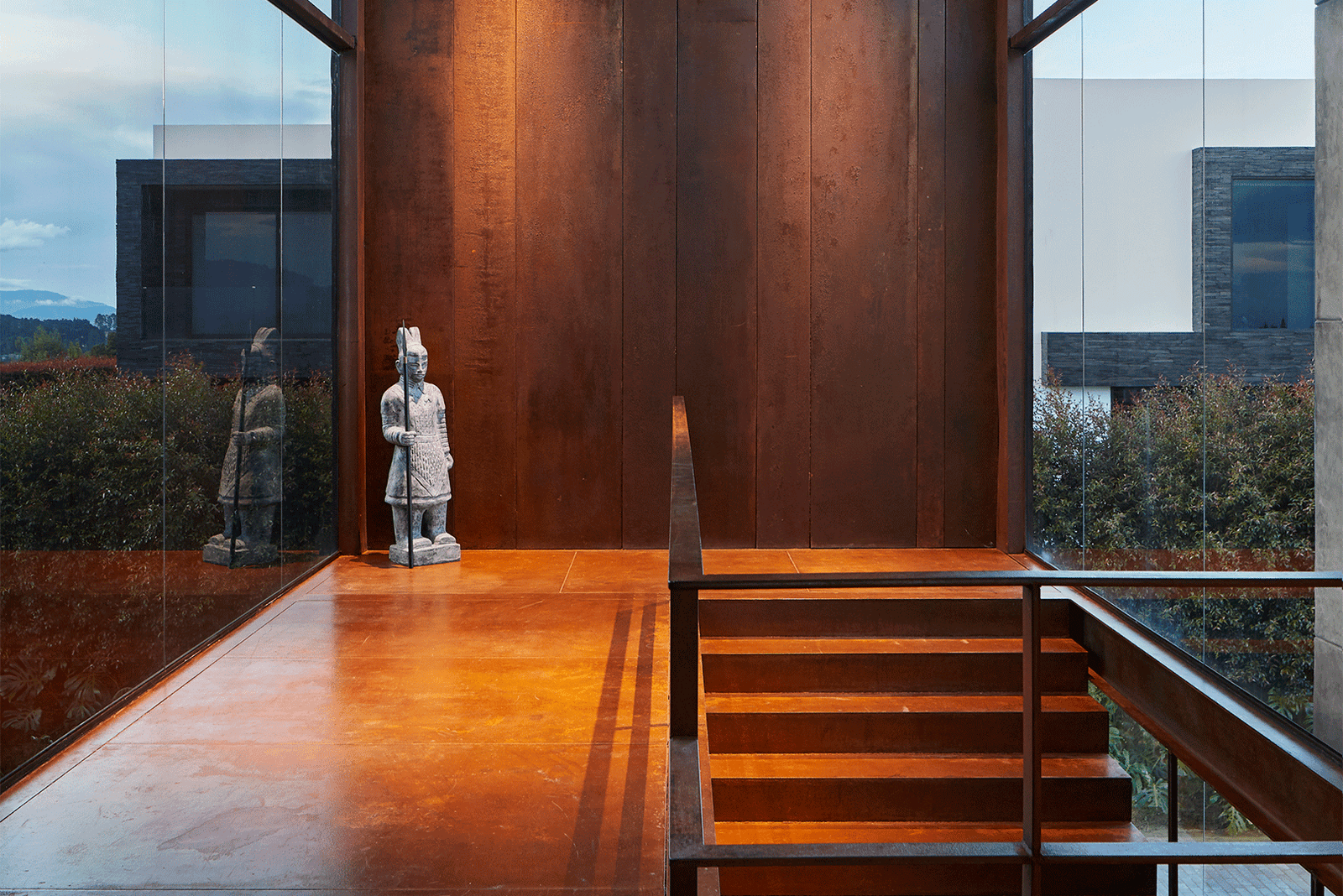 El volumen principal, de dos niveles, se abre mediante fachadas completamente acristaladas que permiten que la luz se convierta en protagonista y que el paisaje ingrese sin restricciones al interior. La doble altura central actúa como un vacío luminoso que organiza la vida social de la casa, mientras que las cubiertas extendidas enmarcan las visuales y protegen las terrazas exteriores.